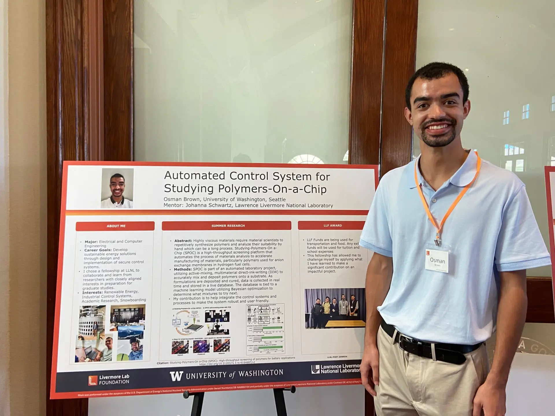 Osman spent the summer designing an automated control system for a high-throughput screening platform used to accelerate the development of polymers for hydrogen fuel cells. His contribution focused on integrating control systems and processes to make the platform more robust and user friendly. Osman shared: “Interning at LLNL helped me clarify my career goals. I am inspired to push my engineering career forward and thankful to the donors who supported my LLF Fellowship.” A special thank you to Johanna Schwartz, Osman’s LLNL mentor for making this full-year fellowship experience possible.